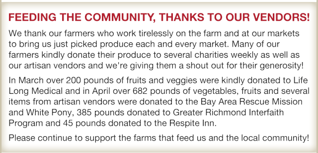 Let's Celeberate Dad!Have a BBQ for dad in honor of Father's Day!Grilled Peaches RecipeGrilled Squash RecipeMark your calendars for special events!July 8 Cherry TastingJune 15 Kids Activity with the Gardnes at Heather Farms!July 14 Art Booth at Orinda STAR OF THE MONTH: STONE FRUITWant to Know what else is in Season? Click here to find out!We are proud to offer Cal Fresh and Square at our MarketsCCCFM Facebook PageWalnut Creek FM Facebook PageOrinda FM Facebook PageCCRMC FM Facebook PageTweet With Us!