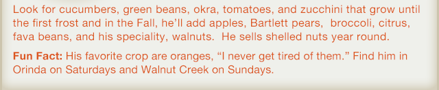 Open MarketsOrinda, Sat. 9-1pmWalnut Creek, Sun. 9-2pmCCRMC Martinez, Tue. 10-2pm
